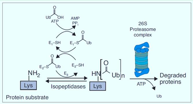 蛋白酶体是溶解蛋白的大分子复合物,通过泛素——蛋白酶体途径参与多种蛋白质和调节蛋白的降解过程,从而参与血管新生、细胞黏附、细胞因子生成和细胞凋亡等多种细胞生物过程。泛素——蛋白酶体通路成为肿瘤药物发现的重要靶标,一系列药物被开发出来。该通路的发现者因该成果获得2004年度诺贝尔化学奖。