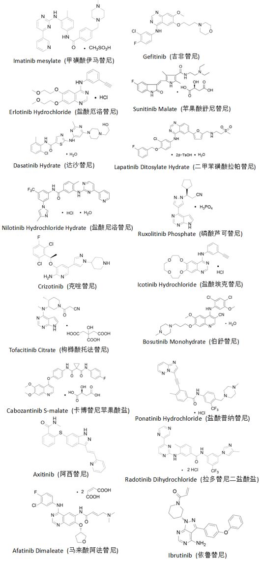 已上市的31个替尼类药物,从2001年的甲磺酸伊马替尼,到2018年的Fostamatinib disodium hexahydrate,全部为小分子化学药物,非常值得系统浏览-推敲,化学结构见图2。