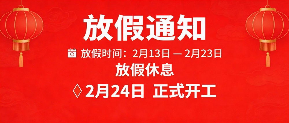 岁序更替,华章日新。为让全体员工度过一个平安、祥和、团圆的新春佳节,结合公司经营实际,现将2026年春节放假安排通知如下:2月13日至2月23日放假休息,2月24日正式开工。请全体员工放假前做好工作收尾与安全排查,出行注意人身与财产安全;愿大家满载一年收获,平安归家、与家人团聚,共度欢乐新春。